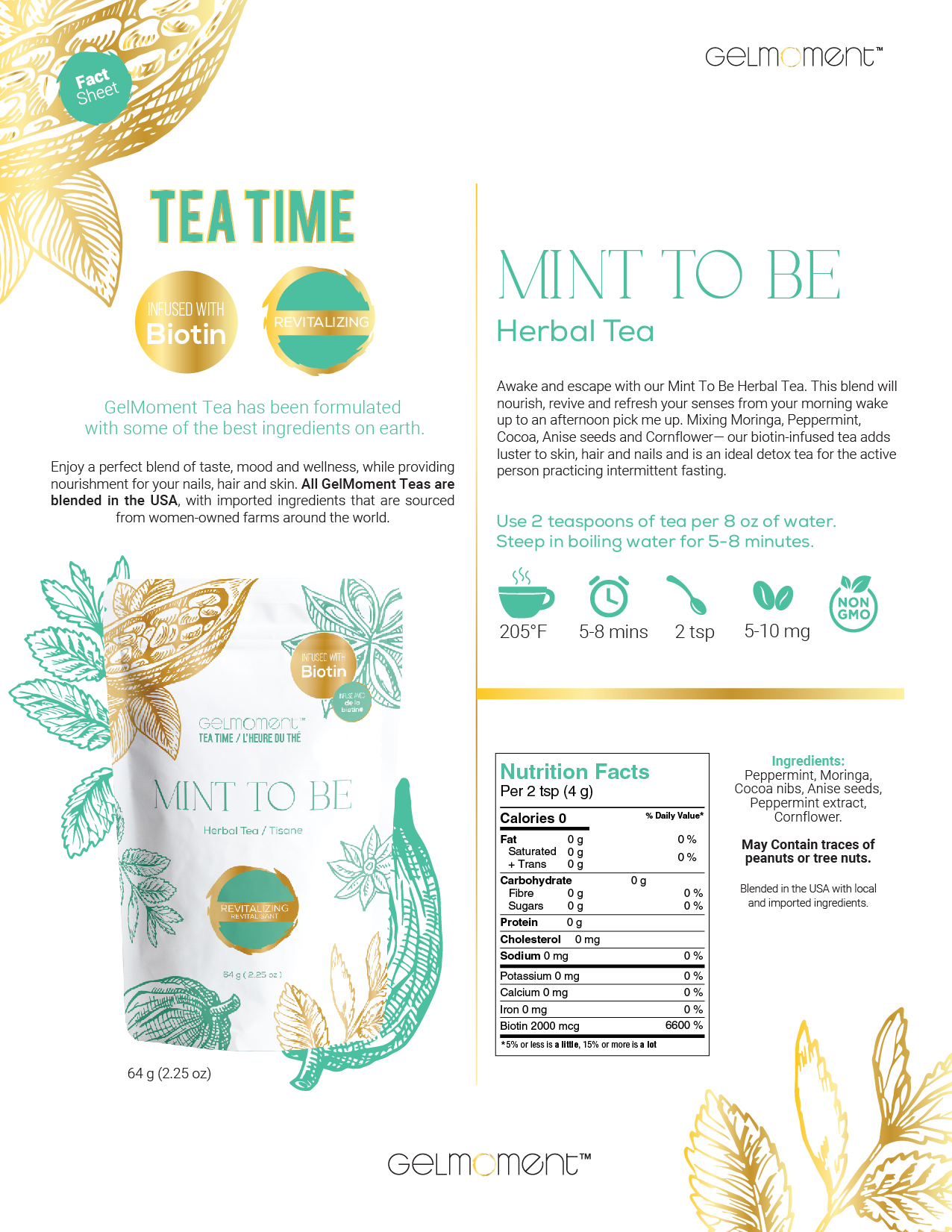 Awake and escape with our mint to be herbal tea. This blend will nourish, revive, and refresh your senses from your morning wake up to an afternoon pick me up. Mixing moringa, peppermint, cocoa, anise seeds and cornflower— our biotin-infused tea adds luster to skin, hair and nails and is an ideal detox tea for the active person practicing intermittent fasting.